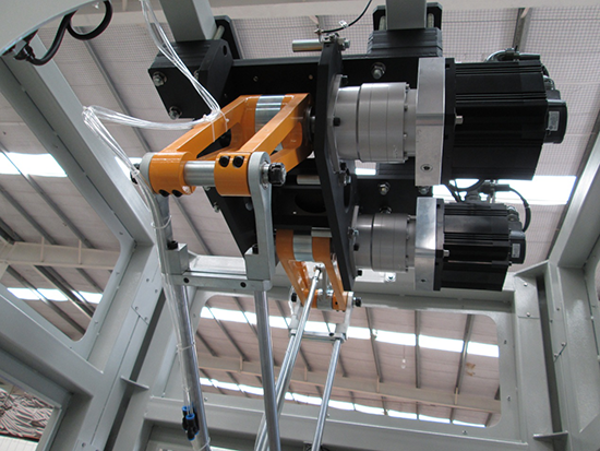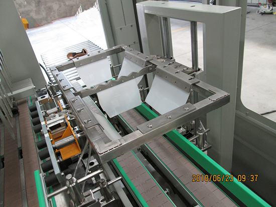 将输送过来的瓶(或盒子)整理排列为规定形式后,输送到并联机器人抓手处,抓手动作将排列好的瓶子(或盒子)抓起,再水平移动,装入到空箱输送定位好的箱子中,装完后箱子输出,整个过程流畅、简捷明了。装箱速度可以达8-12箱/分。